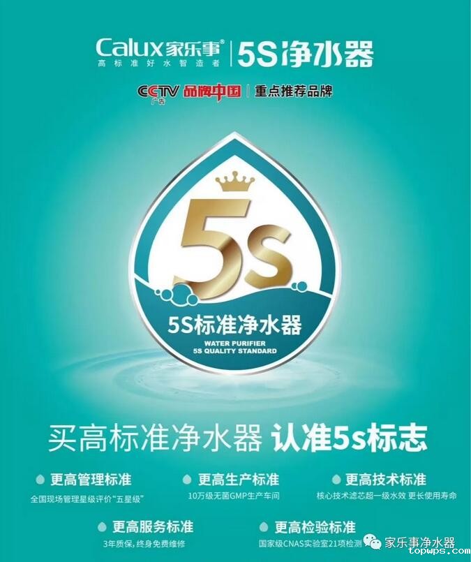 自主品牌“Calux点点彩票app下载官网最新版安卓”以高标准好水智造者为定位,打造5S净水器。即更高技术标准、更高生产标准、更高管理标准、更高检测标准、更高服务标准;五好水质:好质地、好色泽、好口感、好健康、好安心。
