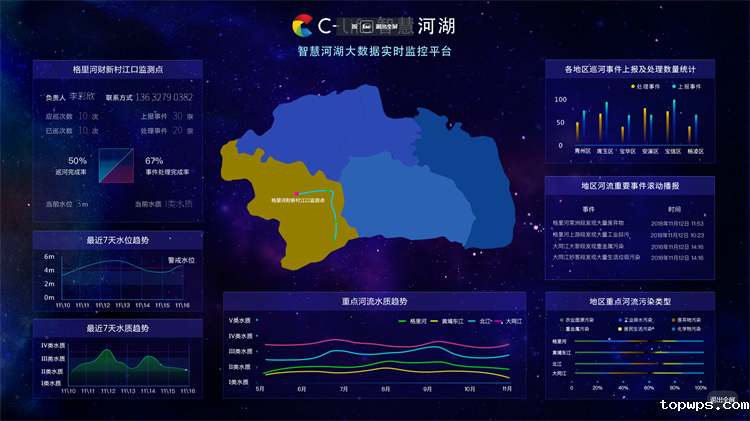 从「大数据中心」的“水质地图”上,可以看到地表水、自来水、直饮水的TDS值等水质情况。而「智慧水环境」能展现流域水、水库/湖泊、水源地、养殖水、景观水、泳池水更加详细的数据,比如格里河财新村江口监测点最近七天的水位和水质趋势,该村当前水位和水质等级,另外诸如巡河事件、流域重要事件、污染类型等都会在屏幕上进行滚动播报。