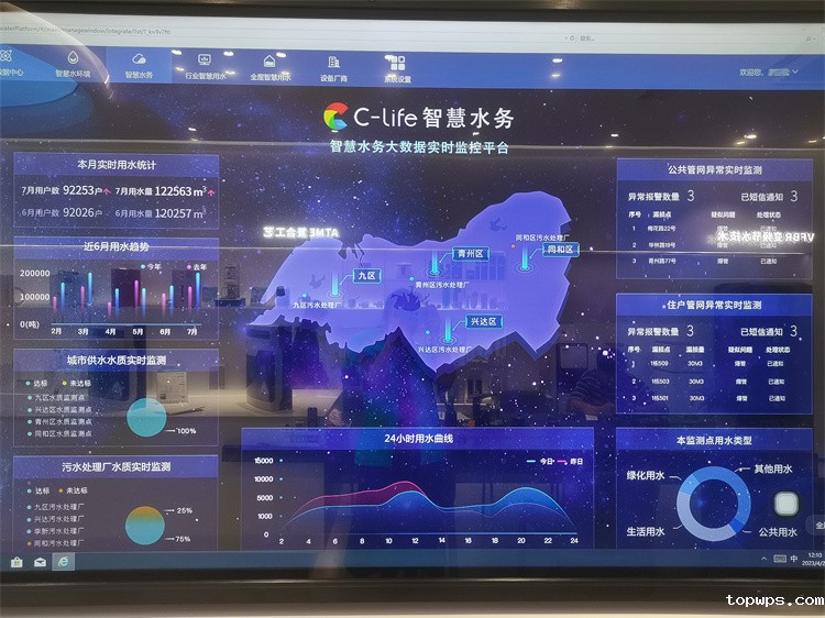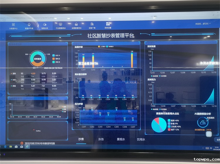 「智慧水务」里的“数据地图”展现了综合水务、社区供水、分质供水、用水分析、管网分析、供水调度等内容,可以清楚地了解本区域城市供水、污水处理厂水质是否达标。它能及时更新公共、住户管网的破损点和处理状态,以及本区域消火用水的总量和消防栓总量数据等。并且,它还可对水质进行在线分析,对管网、社区水质的TDS(溶解于水中的总固体含量)、TOC(总有机碳含量)、COD(化学耗氧量)、UV254(在波长为254nm比色皿光程下的紫色吸光度)等数值进行监测。