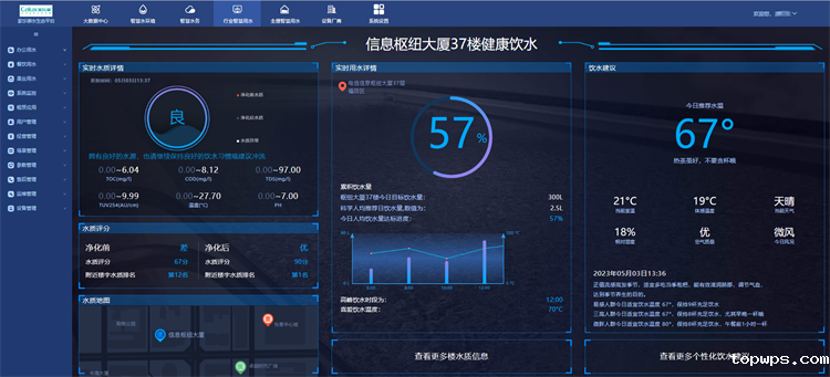 在「行业智慧用水」里面,可以看到平台对家庭用水、办公用水、美业用水,以及社区、餐饮、校园等不同用水场景进行着数据监测——如总用水量、各场景用水占比,水质、水压、净水量、用户数等数据,实现用水可查、可监测,例如对办公用水进行监测,以信息枢纽大厦37楼的实时水质详情为例,可以清楚的看见水的TDS、COD、TOC、UV254、温度、PH,净化前和净化后的水质对比,人员每日饮水量等。