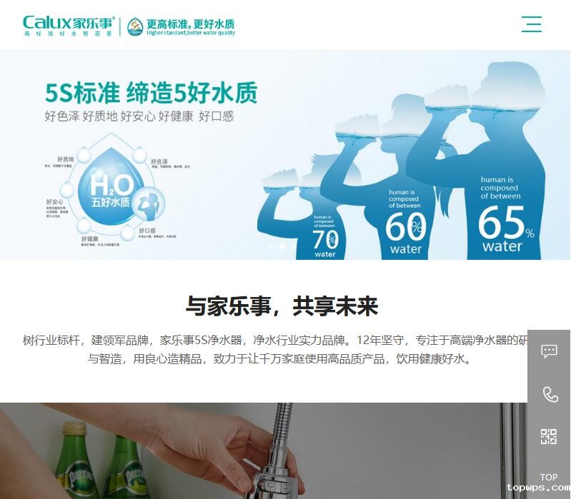 第二从技术层面做了一些升级,采用DIV+CSS+PHP的开源程序语言,使用的是阿里云的高配云服务器,采用懒加载的页面打开提速功能,在页面兼容、响应、开源等相关基础服务上做了很大的升级。此外在内容呈现上采用的是自适应界面设计方式,内容能兼容不同的终端使用设备的尺寸,兼容性以及整体用户的使用体验会更贴心,另外采用HTML5的程序语言,整体交互性以及人机互动上表现更佳。自适应手机和平板,更能满足新人类走读的习惯,抖音与官微的互联互通,360全景展示,能更直观的在线参观净水器厂家实景,让“连接”变得更为简单。