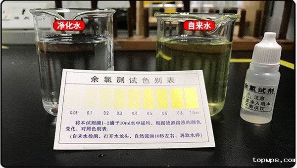 测试方法:采用滴定法测试原水(自来水)和 纯水中的余氯含量,如TDS测试实验方法,分别在两个烧杯中取自来水和纯水水样20ml,再按照测试溶液使用说明往测试样本中滴定测试溶液,然后通过比色卡显示测试样本中余氯含量。