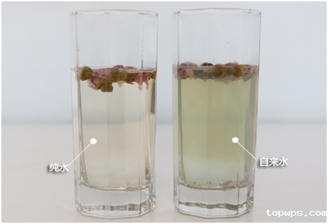 实验方法:使用同样的茶杯、茶叶(玫瑰花茶、铁观音)、茶叶量等量,再分别使用同样温度(95℃)的纯水和自来水沏茶,然后观察茶汤颜色。