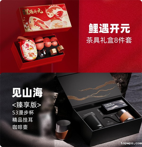 “鲤遇开元茶具礼盒8件套”或“见山海咖啡套装礼盒”