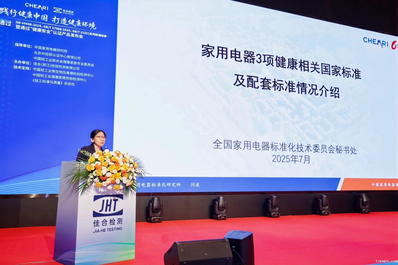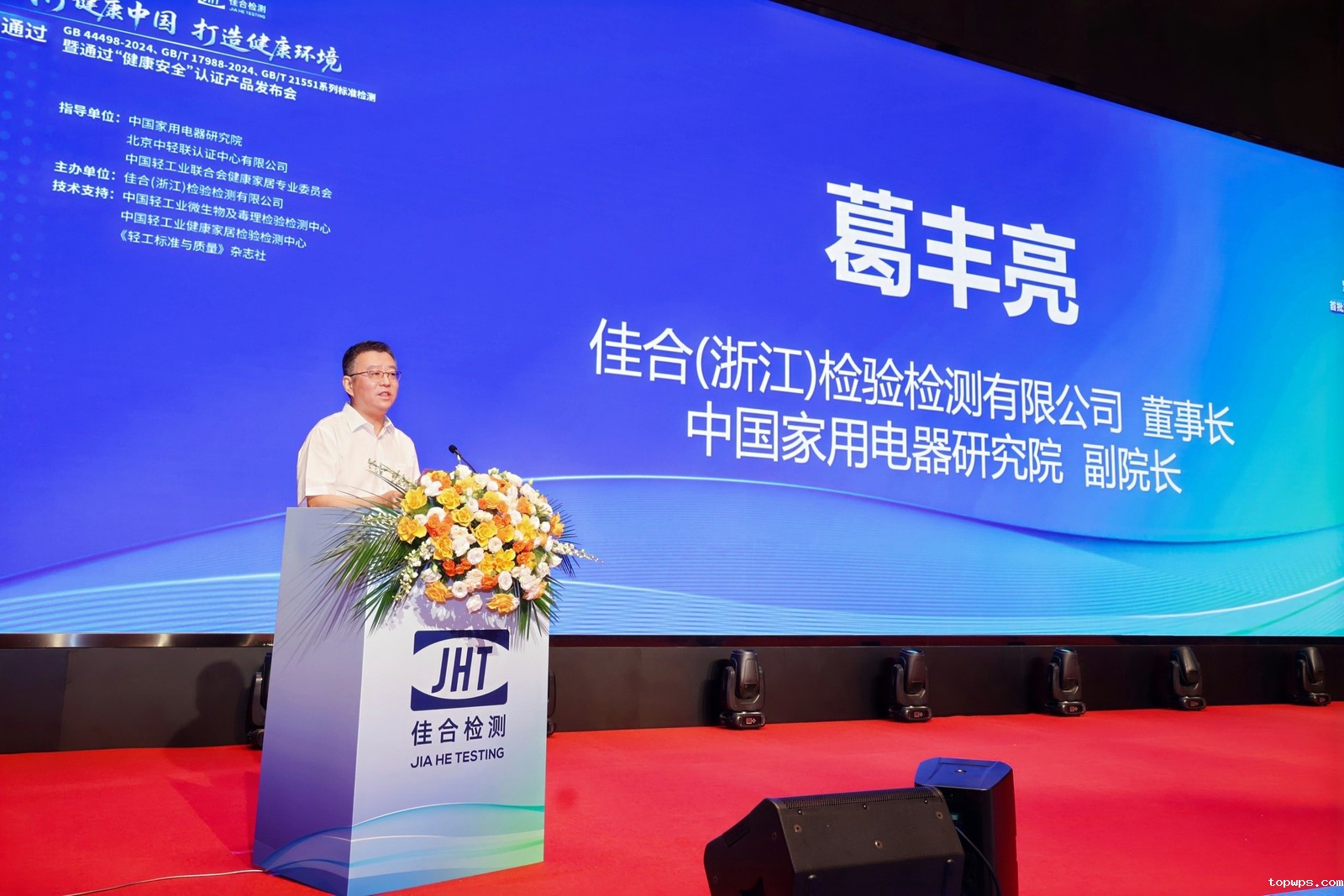 发布会现场,中国家用电器研究院副院长、佳合检测董事长葛丰亮强调:佳合检测积极响应党的二十大提出的“推进健康中国建设”战略,通过"技术检测+权威认证"的创新模式,联合北京中轻联认证中心推出的"健康安全"认证体系,涵盖空调、冰箱、洗衣机、净水设备等近20个品类。